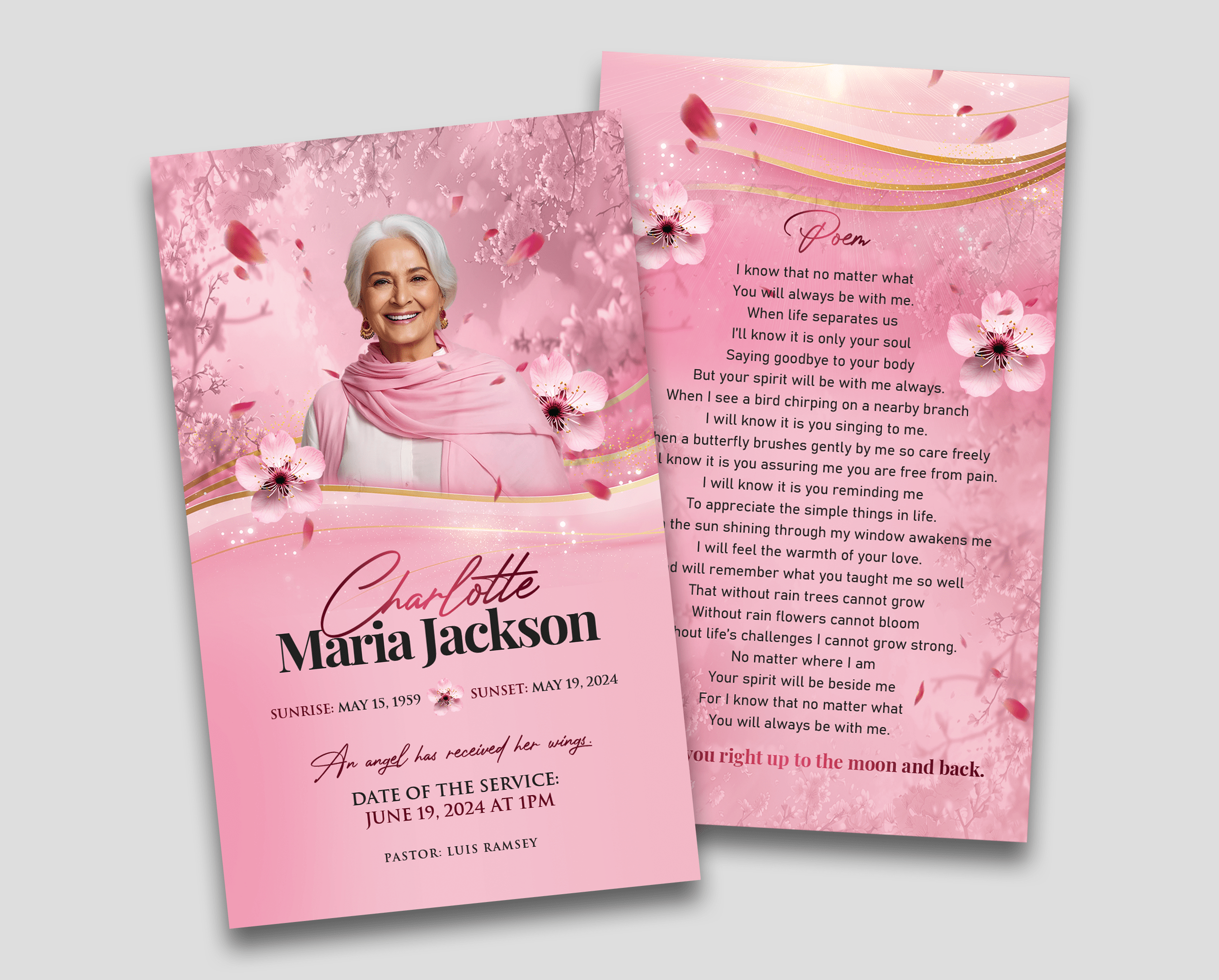 Keep their memory close with the Cherry Blossom Funeral Prayer Card Design — a beautifully designed digital keepsake featuring gentle cherry blossom motifs and a peaceful, refined layout. Add your loved one’s photo, name, and a favorite prayer, poem, or scripture for a truly personal tribute.