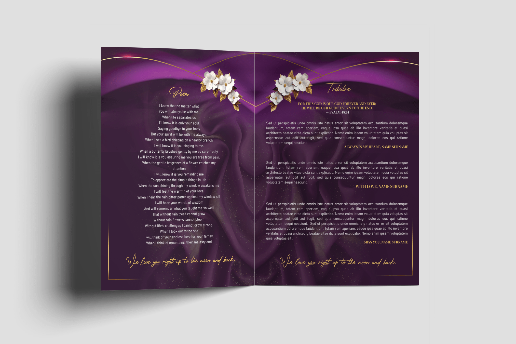 Our condolences to you on the loss of your loved one. We look forward to working together to create a perfect memorial booklet for you – with this beautiful Purple Blossom Funeral Program Design — a beautifully crafted, digital memorial funeral service program featuring elegant purple floral accents and a refined, respectful layout. Thoughtfully designed to reflect beauty and grace, this funeral program allows you to incorporate your loved one’s photos, obituary, order of service, and any personal tributes you wish to include.